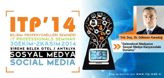 Antalya’da 30 Ekim – 2 Kasım 2014 tarihlerinde düzenlenen ITP’14 Bilişim Profesyonelleri Semineri’nin (IT Professionals Seminar) bu yılki teması sosyal medyaydı. Gökmen Karadağ seminerde “Geleneksel Medyanın Sosyal Medya Karşısındaki Durumu” başlıklı bir konuşma yaptı. İstanbul Aydın Üniversitesi İletişim Fakültesi’nde “İleri TV Uygulamaları” dersinde yeni medya, sosyal medya, yurttaş haberciliği, Internet TV, IPTV, OTT gibi konuları işleyen Gökmen Karadağ, seminerde geleneksel medyanın sosyal medya karşısında yaşadığı şaşkınlığı, ardından uyum ve daha sonra da nüfuz çabalarını anlattı. Gökmen Karadağ’ın geleneksel medya ve sosyal medya arasındaki etkileşim ve dönüşümü, teorik ve saha tecrübesiyle harmanlayarak anlattığı konuşma, bilişim profesyonellerinin büyük ilgisini çekti.